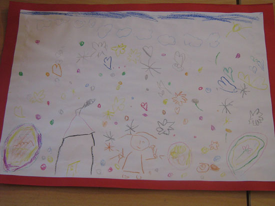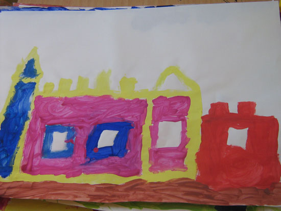 Ein Bild wächst wie eine Pflanze. Hundertwasser hat sehr langsam gemalt. Oft hat er sich jahrelang Zeit gelassen, bis ein Bild für ihn wirklich fertig war. Dabei hat er natürlich nicht die ganze Zeit daran gesessen. Er malte daran, stellte es zur Seite, begann ein anderes, machte eine Reise und malte danach weiter. Das Bild wuchs. Er nannte dies: vegetetative Malerei.Die Kinder hatten am Ende der Angebote immer noch etwas Zeit, um an ihrem Bild zu malen. Über einen Zeitraum von 5 Treffen ist dann dieses Bild entstanden.